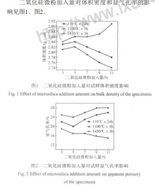 在110 ℃×24 h條件下烘干時(shí),當(dāng)二氧化硅微粉加 入量小于5%時(shí),由于二氧化硅微粉的顆粒小,分散性 好,可以填充顆粒與顆粒間的空隙[1],這使材料顆粒堆 積的致密度逐漸提高,氣孔率減少,體積密度逐漸增 加 (圖1);隨著二氧化硅微粉加入量的增加,材料中的氣孔率逐漸減少,材料致密度逐漸增加,體積密度 就逐漸增大;當(dāng)二氧化硅微粉加入量大于5%時(shí),隨著 二氧化硅微粉加入量的逐漸增多,二氧化硅微粉充填 空隙后出現(xiàn)過剩導(dǎo)致材料堆積致密度下降;同時(shí)大量 的二氧化硅微粉水化產(chǎn)物烘干后失去自由水和部分結(jié) 合水導(dǎo)致材料氣孔率逐漸增大 (圖2),從而使試樣的 體積密度逐漸減小。 在1 100 ℃×3 h條件下燒結(jié),試樣體積密度普遍小 于110 ℃×24 h樣品的體積密度 (圖1),而氣孔率普遍 高于1 10 ℃×24 h樣品的 (圖2)。因?yàn)樵? 100 ℃時(shí), 由于燒成溫度低,試樣達(dá)不到燒結(jié)溫度,材料內(nèi)部形 成的液相量少,不足以填充空隙以提高材料的致密度; 在此溫度下,試樣的主要變化是二氧化硅微粉水化產(chǎn) 物的完全脫水,二氧化硅微粉加入量越多,二氧化硅 微粉水化產(chǎn)物脫水引起氣孔率增加而導(dǎo)致體積密度減 小的影響就越強(qiáng),故隨著二氧化硅微粉加入量的增大, 試樣的體積密度呈減小的趨勢(shì);同時(shí)作為結(jié)合劑的二 氧化硅超微粉在升溫過程中發(fā)生晶型轉(zhuǎn)化,引起試樣 體積膨脹[2],體積密度變小。 在1 450 ℃×3 h條件下燒結(jié),試樣體積密度普遍增 大 (圖1)。隨二氧化硅微粉加入量的增加,試樣體積 密度逐漸增大,氣孔率逐漸降低 (圖2)。在1 450 ℃ 下,鎂質(zhì)澆注料中的MgO和SiO2生成鎂橄欖石[3],即: 2MgO+SiO2→2MgO·SiO2,這使材料燒結(jié),體積收縮, 結(jié)構(gòu)致密程度提高,體積密度增大。隨二氧化硅含量 的增加,2MgO·SiO2生成量逐漸增加,體積密度逐漸 增大,氣孔率逐漸降低。