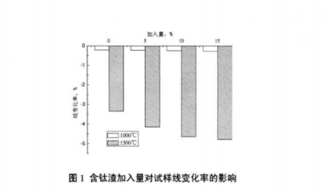 圖1所示為含鈦渣的/JnA.量對試樣熱處理后線變化率的影響。由圖l可以看出,隨著含鈦渣加入量的 增加,經(jīng)1000*Cx3 h熱處理后的試樣的線變化率相差不大,都存在0.2%左右的收縮。但經(jīng)1500"Cx3 h 熱處理后的試樣的線變化率則相差較大,隨著含鈦渣加入量的增加而收縮增大,主要是因為含鈦渣的加 入促進了材料的燒結(jié),加入量愈大收縮愈大。但含鈦渣的加入量由10%增加到15%后,試樣的線變化率 變化趨緩,可能由于鈦酸鋁的大量形成,其膨脹抵消了部分的燒結(jié)收縮。