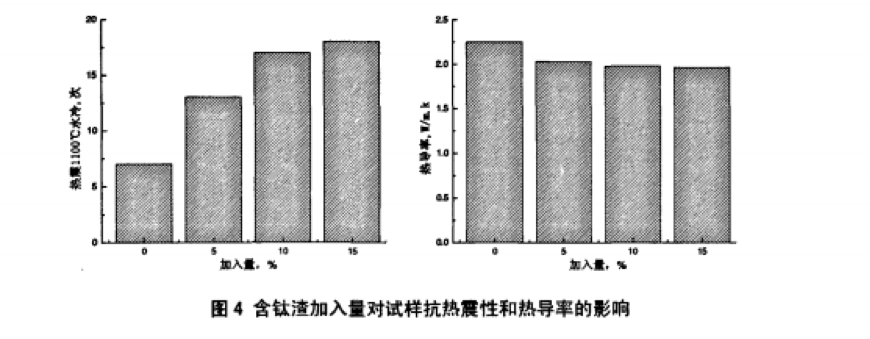 圖4所示為含鈦渣添加量對試樣抗熱震性和1000℃時熱導率的影響。由圖可以看出,含鈦渣的加入 明顯提高了試樣的抗熱震性,降低了試樣的熱導率,且隨著含鈦渣加入量的增加熱震次數(shù)呈上升趨勢、 熱導率呈下降趨勢。但隨著含鈦渣加入量增加,試樣的抗熱震性和熱導率改善趨緩,這可能是由于試樣 中雖有大量鈦酸鋁形成且量逐步增大,但試樣由于燒結(jié)好而致密化導致了未現(xiàn)明顯改善趨勢。