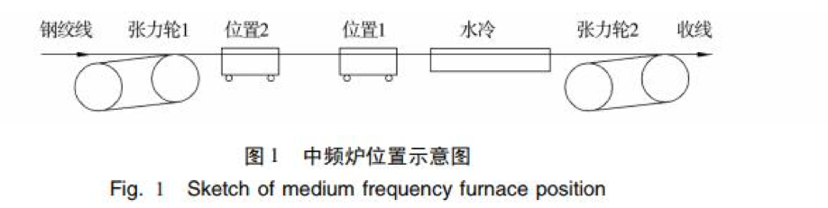 預(yù)應(yīng)力混凝土鋼絞線生產(chǎn)中,鋼絞線穩(wěn)定化處 理生產(chǎn)線使用的中頻感應(yīng)加熱爐為移動式( 如圖 1 所示) 。生產(chǎn)線停止運行時中頻感應(yīng)加熱爐處于位 置 1,生產(chǎn)線啟動運行時中頻感應(yīng)加熱爐由位置 1 向與穩(wěn)定化處理鋼絞線反方向移動至位置 2,生產(chǎn) 結(jié)束時中頻感應(yīng)加熱爐由位置 2 移動至位置 1。正 常生產(chǎn)中鋼絞線經(jīng)中頻感應(yīng)加熱爐加熱后進入生產(chǎn) 線冷卻水槽( 圖 2) 冷卻,再經(jīng)壓縮空氣吹干。生產(chǎn) 線停止運行時,在中頻感應(yīng)加熱爐由位置 2 移動至 位置 1 過程中,其兩端自帶的冷卻與吹干裝置自動啟動,對位置 2 與生產(chǎn)線冷卻水槽之間的部分鋼絞 線進行冷卻、吹干處理,從而使這部分鋼絞線與正常 生產(chǎn)的鋼絞線性能一致,以降低消耗,提高鋼絞線的 成材率。