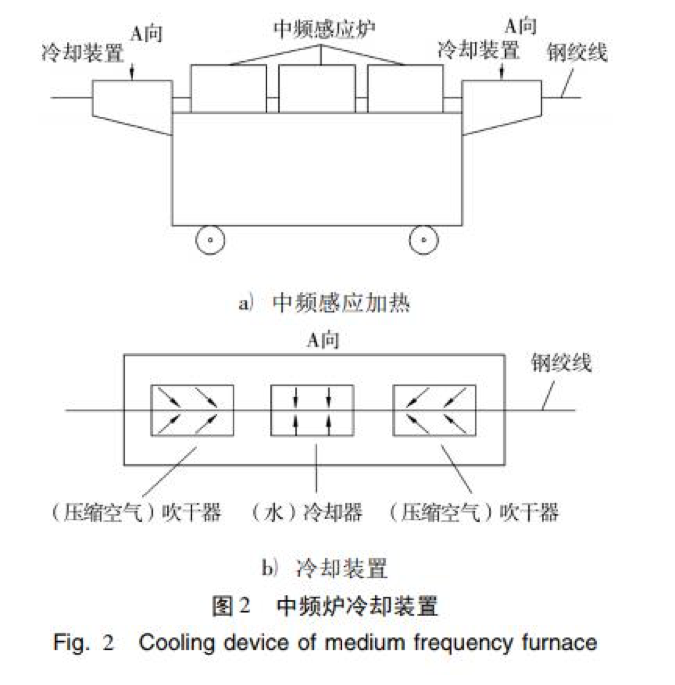 低松弛預(yù)應(yīng)力混凝土用鋼絞線廣泛應(yīng)用于高層 建筑、大跨度橋梁、核電站安全殼中[1]。由于預(yù)應(yīng) 力鋼材的應(yīng)力松弛,預(yù)應(yīng)力混凝土結(jié)構(gòu)中的應(yīng)力值 逐漸下降,使結(jié)構(gòu)達不到設(shè)計壽命而提前破壞[2]。 穩(wěn)定化處理是鋼絞線獲得低松弛性能較普遍的一種 生產(chǎn)工藝,即鋼絞線在承受 30% ~ 50% 抗拉強度的 張拉力下,進行 350 ~ 400 ℃消除應(yīng)力回火。經(jīng)這種 方法處理的鋼絞線 70% 實際破斷力下連續(xù) 1 000 h 松弛值不大于 2. 5% 。 低松馳預(yù)應(yīng)力鋼絞線生產(chǎn)工藝流程: 放線→鋼 絞線捻制→張力下回火( 穩(wěn)定化處理) →冷卻→吹 干→收線。目前,穩(wěn)定化處理均采用中頻感應(yīng)加熱爐對鋼 絞線進行回火[3]。鋼絞線穩(wěn)定化處理生產(chǎn)線使用 的中頻感應(yīng)加熱爐為移動式,加熱爐兩端帶有冷卻 與吹干裝置,可以提高鋼絞線的成材率。