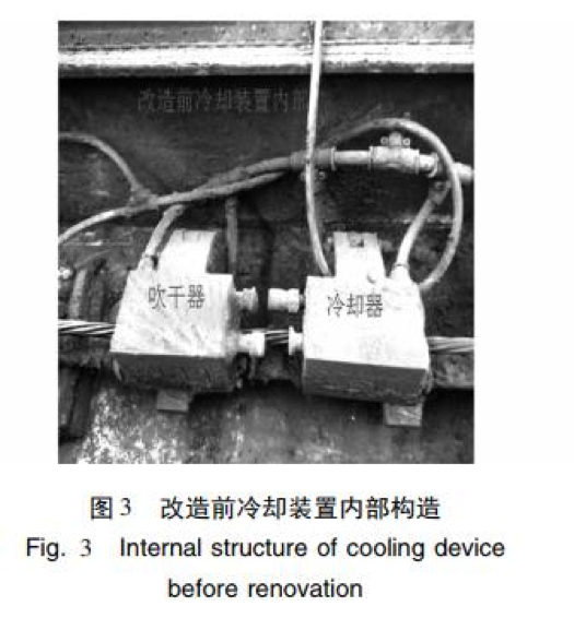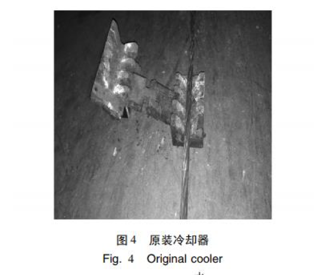 長期生產(chǎn)運行中,發(fā)現(xiàn)中頻爐兩端原 裝的冷卻裝置冷卻效果不佳,既影響產(chǎn)品質(zhì)量,又易 造成鋼絞線整根斷裂,存在極大的安全隱患,對人身 和設(shè)備造成傷害。 正常生產(chǎn)的鋼絞線經(jīng)冷卻后溫度不高于 60 ℃[4],而經(jīng)中頻爐自帶的冷卻裝置一次自動冷卻后 的鋼絞線溫度仍然過高,約 150 ℃ 左右[5],如果此 時生產(chǎn)線啟動,將對此部分鋼絞線進行二次加熱,由 于溫度疊加,造成溫度急劇上升,使鋼絞線加熱溫度 過高,在 30% ~ 50% 抗拉強度的張拉力作用下易造 成鋼絞線整根斷裂。為避免此現(xiàn)象發(fā)生,必須由人 工操作,將中頻爐在位置1 與位置2 之間行走2 至3 次,才能將鋼絞線的溫度降至 60 ℃以下。這樣操作 既浪費時間也降低生產(chǎn)效率。而且由于需要反復(fù)多 次冷卻,中頻爐冷卻器、吹干器等相關(guān)部件使用頻次 增加,維護成本提高。 經(jīng)反復(fù)查找,發(fā)現(xiàn)中頻爐原裝的冷卻裝置( 圖 3) 冷卻效果差與其冷卻器( 圖 4) 有關(guān),原設(shè)計冷卻器與吹干器為銅制合頁式交錯咬齒形結(jié)構(gòu),該設(shè)計 存在以下問題: ( 1) 采用噴淋式冷卻,冷卻面積小。 ( 2) 冷卻器短,長度只有 135 mm。 ( 3) 冷卻水流量小,只有 16 個直徑為 1 mm 的 出水口。 ( 4) 冷卻器數(shù)量少,受設(shè)備總體布局的約束,中 頻爐兩端分別有一個冷卻器。 ( 5) 工作環(huán)境高溫、高油煙,冷卻器出水孔易堵 塞,不能正常工作。 ( 6) 生產(chǎn)線停止運行時,中頻爐由位置 2 向位 置 1 移動過程中,由于鋼絞線沒有張力,受重力作用 鋼絞線自然下垂造成冷卻器磨損。由于冷卻器結(jié)構(gòu) 復(fù)雜難加工,因此制造成本高。