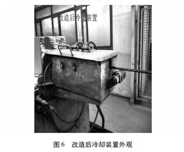 針對原中頻爐冷卻裝置存在的缺陷,經(jīng)過研究 并結(jié)合多年的設(shè)備、生產(chǎn)及工藝方面的相關(guān)經(jīng)驗,設(shè) 計出全新的 V 型直冷式可控大流量冷卻裝置。改 造后冷卻裝置內(nèi)部結(jié)構(gòu)如圖 5 所示,冷卻裝置外觀 如圖 6 所示。 改造后的冷卻裝置特點: ( 1) 新裝置采用加長 V 型水槽儲水冷卻,水槽將原來冷卻水管道直徑由 10 mm 增加到 16 mm,冷 卻水的供給量增大了 2. 5 倍。因為 V 型水槽容積 小能使冷卻水充分快速流動而帶走大量熱量,同時 由于儲水式冷卻能使鋼絞線始終浸泡在冷卻水中, 增大了冷卻的面積,只需一次冷卻即可將鋼絞線冷 卻至60 ℃以下,保證了冷卻的效果。 ( 2) 在冷卻裝置中加裝了導(dǎo)線輥,當(dāng)生產(chǎn)線停 止運行時,中頻爐由位置 2 向位置 1 移動過程中,導(dǎo) 線輥與導(dǎo)線輪對下垂的鋼絞線起到支撐,避免鋼絞 線懸空,使鋼絞線不與噴氣吹干部分及 V 型冷卻水 槽接觸,不會對冷卻水槽產(chǎn)生磨損。 ( 3) 新的冷卻裝置與吹干裝置不會堵塞,完全 能在高溫、高油煙環(huán)境下正常工作,無需清理新的冷卻裝置與吹干裝置使用效果良好,適合所有規(guī)格鋼絞線的生產(chǎn)。改造成本低,使用壽命長。 既避免了鋼絞線整根斷裂,又消除了安全隱患,實現(xiàn) 了無人化操作,提高了鋼絞線的成材率和勞動生 產(chǎn)率。