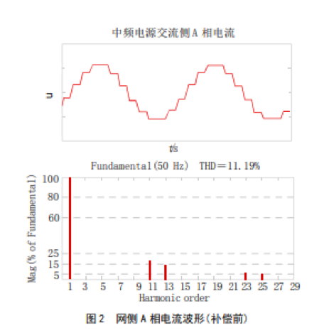 中頻爐注入電網(wǎng)的諧波主要是由于中頻電源的 整流裝置產(chǎn)生的,工業(yè)應用中常見的中頻電源整流 部分為三相橋式整流電路。由以下分析知,三相橋 式整流電路產(chǎn)生的諧波次數(shù)為 6k ± 1(k 為正整數(shù)) 次。為了減少諧波次數(shù),本文中的整流部分采用了 由兩個三相橋式電路構成12相整流電路。假設交流 側電抗為零,而直流電感 Ld 視為無窮大。 橋Ⅰ的閥側線電流與其感應的網(wǎng)側線電流相 同,即iIA=iIa,且電流中僅含6k±1(k為正整數(shù))次 諧波,各次諧波的有效值和諧波次數(shù)成反比,且與 基波有效值的比值為諧波次數(shù)的倒數(shù)。同理,橋Ⅱ 閥側線電壓比橋Ⅰ超前 30°,因而其閥側線電流比 橋Ⅰ超前 30°。 兩個整流橋產(chǎn)生的5、7、11、19、…次諧波相 互抵消,注入電網(wǎng)的只有12k±1(k為正整數(shù))次諧波, 且有效值與諧波次數(shù)成反比,而與基波有效值的比 值為諧波次數(shù)的倒數(shù),波形與頻譜如圖 2 所示