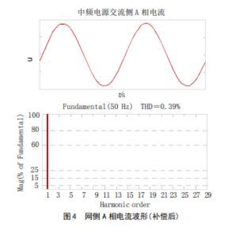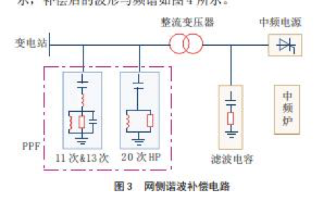 中頻爐諧波的補償可以通過安裝濾波器來治理。 根據(jù)濾波器結構和原理,可將其分為有源濾波和無 源濾波兩種方式。有源濾波器(APF)本身也是一種電 力電子裝置,它能對大小和頻率都變化的諧波以及 變化的無功進行補償。其基本原理是從補償對象中 檢測出諧波電流,然后產(chǎn)生一個與諧波電流大小相等而極性相反的補償電流與電網(wǎng)提供的電流疊加, 從而使注入電網(wǎng)的總的電流只含基波分量。無源濾 波器( PPF)是由電容器、電抗器和電阻通過串并聯(lián)結 合組成的一種補償裝置,其基本原理是通過電容電 抗諧振時的低阻抗特性來吸收諧波,從而達到濾波 的目的。有源濾波器的濾波效果要優(yōu)于無源濾波器, 適用于諧波成分復雜,諧波量變化較大的環(huán)境使用, 但其結構復雜,價格昂貴,維護成本也比較高。無源 濾波器具有投資少,結構簡單的特點,同時還兼有 無功補償?shù)淖饔?。但濾波效果受系統(tǒng)和負荷變化的影響較大,可能在一些情況下還會引起諧波電流放 大。由于中頻爐諧波電流產(chǎn)生的特點,本文采用了 無源濾波器對中頻電爐其整流裝置的諧波進行補償,如圖3所 示,補償后的波形與頻譜如圖 4 所示