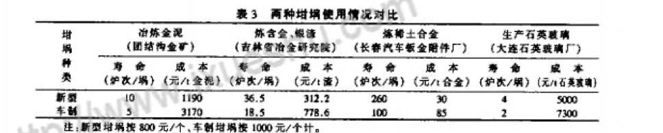 根據(jù)用戶反饋的情況,兩種中頻電爐坩堝的使用性能差別很大。新型石墨坩堝無砂眼、不滲漏;耐腐蝕性均勻,使用壽命長而穩(wěn)定。電極車制坩堝常出現(xiàn)砂眼和滲漏,并且無規(guī)則,使用壽命長短不一.很難掌握冶煉爐次,經(jīng)常造成漏爐事故。兩種中頻電爐坩堝的使用情況對比見表3。